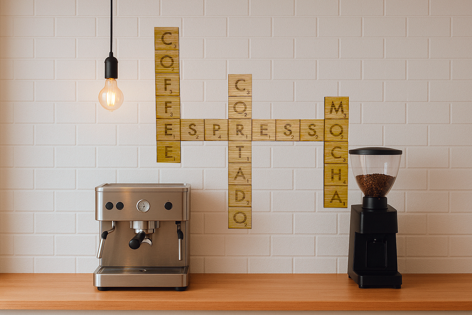 Giv dit kaffehjørne et strejf af varme og personlighed med Kaffekryds – en laserskåret vægdekoration i egetræsfinéret MDF. Klassiske kaffebegreber som espresso, cortado, coffee og mocha danner et elegant ordmønster, der fanger øjet og skaber stemning.
